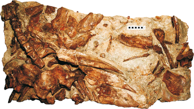 The holotype, NHMUK 3775 (previously BMNH R3775) is a chunk from the front end of a skeleton (vertebrae from the neck and back, ribs, both shoulder girdles, shoulder spines and numerous other osteoderms) and pieces of skull. In 1841, Mantell referred a second specimen to Hylaeosaurus from a layer of "blue clay" near Bolney, West Sussex. According to "the most intelligent of the workmen", a strata of paving stone was removed to reveal "a great number of ribs, vertebrae, and large bones", into which they immediately drove their pickaxes! All that was worth collecting was one "perfect" humerus that turned out to be a left shin (BMNH 2615), a left shoulder blade (BMNH 2584) that Nopcsa used to Frankenstein Polacanthoides ponderosus in 1929, a partial right shoulder blade (BMNH 2620a), a finger bone, and many bashed fragments. Likewise, a third specimen, collected from a quarry at Tilgate Forest by Mantell in 1837, was battered at the hands of labourers, but parts of twenty-six vertebrae, chevrons and armour plates (BMNH 3789) were salvaged. Neither specimen can be assigned to Hylaeosaurus with any confidence, due to a lack of overlapping parts for comparison to the holotype and the presence of another armoured dinosaur — Polacanthus, which is known mostly from a chunk of rear end — in the same areas. Additional remains have been discovered at Sussex and on the Isle of Wight (UK), Westfalen (northwestern Germany), and Ardennes (France), may or may not belong to Hylaeosaurus. But teeth referred to Hylaeosaurus by Owen in 1858 (NHMUK 2310, 3326, 26034, 36488, 43172, R647, R647a and R739) most certainly belong to an indeterminate sauropod. Hylosaurus (Fitzinger, 1843)